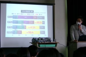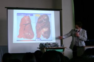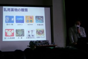 講師に、学校薬剤師の岩島弘和氏にお越しいただき、「薬」「たばこ」「アルコール」についてのお話を伺いました。保健の授業ですでに学習している内容ですが、特に「薬物乱用」に関わってはデータや写真を基に専門家からお話しいただいたことで、生徒たちはその怖さ、恐ろしさを改めて実感していました。