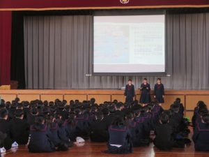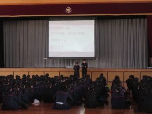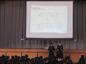 さて、週明けの9日(月)の1時間目には1・2年生で「出発集会」を行いました。プレゼンを使ったり、実際に動きで見せてみたりするなど、各学級が今年1年取り組んできた取組と来年度に向けた決意を発表するものです。